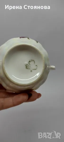 Захарница с вместимост 250 мл, височина с капак 13 см, без 8 см, ширина с дръжки 14 см. Почти незабележимо протриване н златен кант и на 2 места фабрично зацапване със злато. Цена 35 лв.
