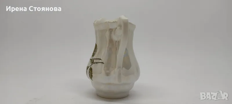 Каничка за мляко с вместимост 180 мл, височина 10 см, ширина с дръжка 10 см. Много леко прекъсване на златен кант на едно място и фабричен дефект в шарка. Цена 20 лв.