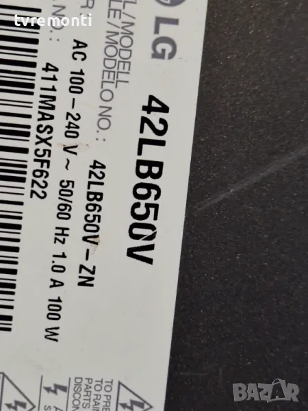 POWER BOARD ,EAX65423701(2.0),LGP3942-14PL1, for LG 42LB650V-ZN for 42 inc DISPLAY T420HVJ01.0 борда е vestel гарантирано работещ Демонтиран от телевизор LG модел 42LB650V-ZN със счупен дисплей T420HVJ01.0 тествана от нашия техник Ремонт на всички марки съвременни телевизори