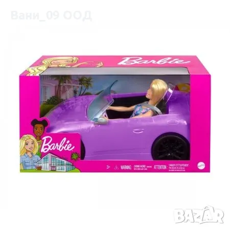 Децата могат да тръгнат на пътешествие с куклата Барби® и нейния лилав кабриолет! Този комплект с кукла и автомобил включва стилна кола с отворен покрив, спортен дизайн, място за двама и реалистични детайли, като матово черно решетка и колела, колани за безопасност и сребристи акценти. Забавните елементи с характерен стил на Барби® включват персонализиран номер на колата и емблема на капака със силует на Барби®. Куклата Барби® е облечена в модна рокля с принт на палмови листа и стилни бели сандали, готова за всяко приключение, което децата могат да си представят. Куклата не може да стои сама. Цветовете и декорациите могат да варират.