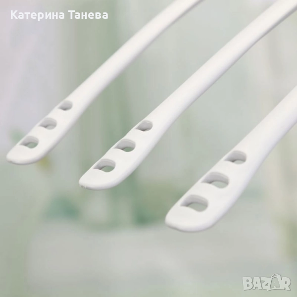 Закачалката е изработена в бял цвят, който е съвместим с всеки вид интериорен дизайн и гардероби, без да създава дисбаланс.