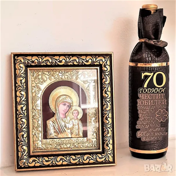 Настолна, златна икона Богородица с ефектна рамка и стъкло в допълнение с апликирана с кожа във формата на торбичка, бутилка с дървена плочка с оригинално пожелание, и златни цифри съответстващи на повода.