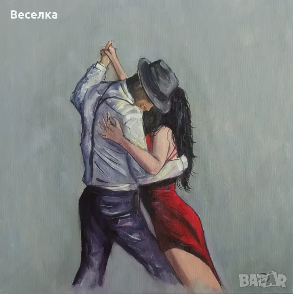 Рисувана картина директно от художника - танцуваща двойка, размер 30х30 см, маслени бои, висококачествено българско платно на подрамка. Продава без външна рамка. Нова, 2023 г., подписана.