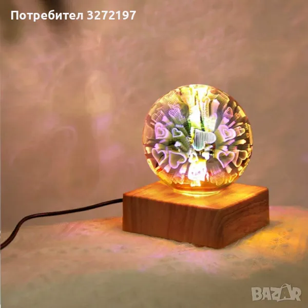 3D USB LED Нощна Лампа (любовно сърце),с дървена основа и превключвател на кабела.
