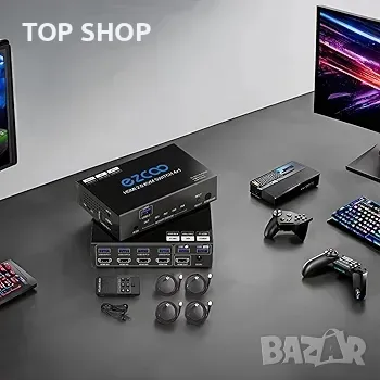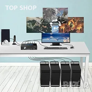 4 в 1 изход HDMI KVM превключвател с 4 порта USB3.0 / USB3.1 аудио изход --- Моля, използвайте по-малко от 3 mtr AWG26 HDMI2.0 стандартен кабел --- Контролирайте 4 HDMI източника/4 лаптопа с един комплект USB клавиатура +мишка, механична клавиатура за игри --- IR дистанционно управление с IR удължителен кабел -- Автоматичен KVM превключвател HDMI HDCP Bypass Audio Extractor 5.1ch 2.1ch.