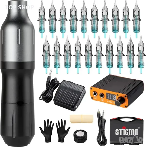 Пакетът включва: Комплектът машина за писалка Stigma Tattoo включва писалка за татуиране, захранване, крачен педал, 20 игли за патрони за татуировки, лента за татуиране, тренировъчна кожа и чифт ръкавици с пластмасова кутия. След като получите нашия комплект, моля, проверете дали горните аксесоари липсват.