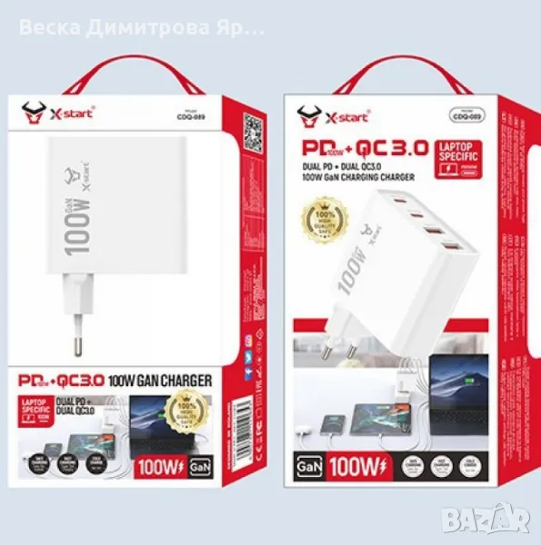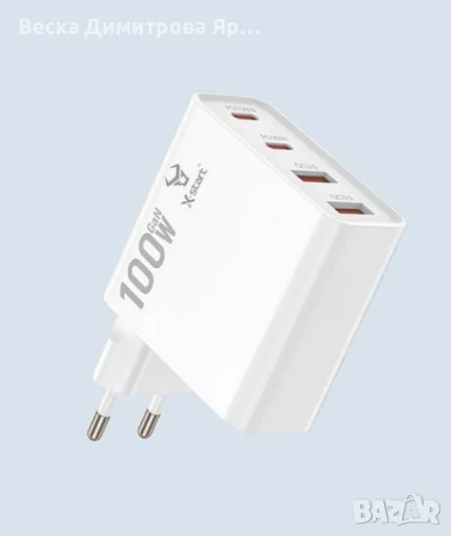 Мощност: 100W;Технология: GaN (галиев нитрид) за по-висока ефективност и по-компактен размер;Портове: 2x TYPE-C, 2x USB-A;Поддържани стандарти за зареждане: PD (Power Delivery) и QC (Quick Charge);Поддържа зареждане на лаптопи;Цветове: бял и черен.1г гаранция