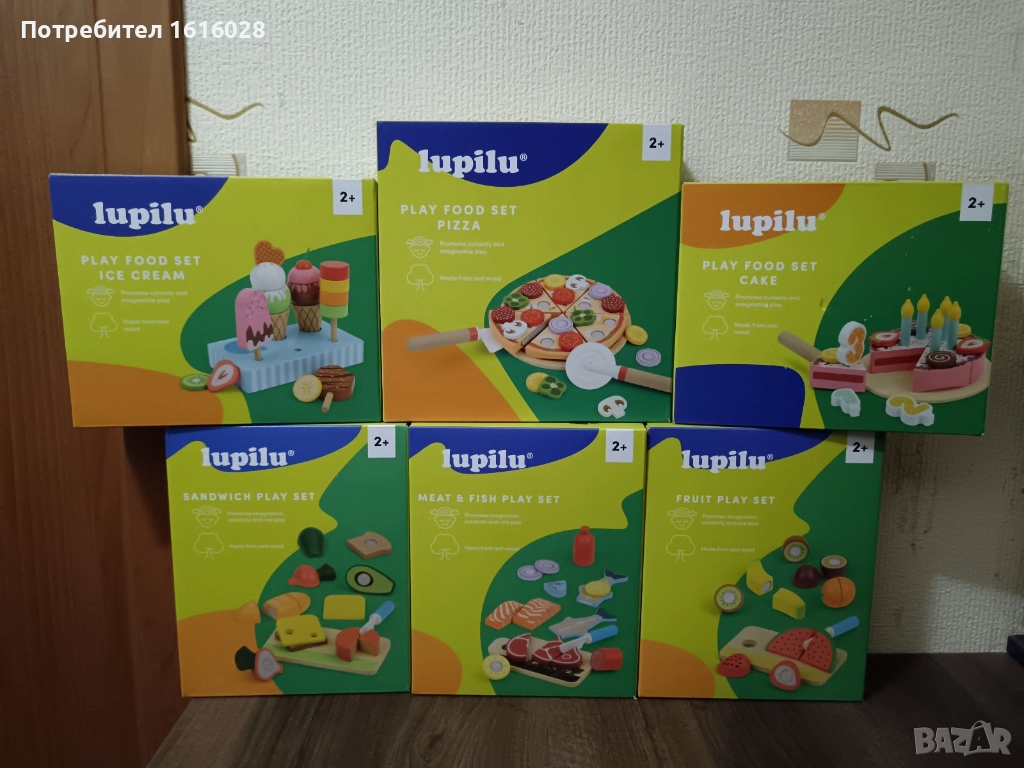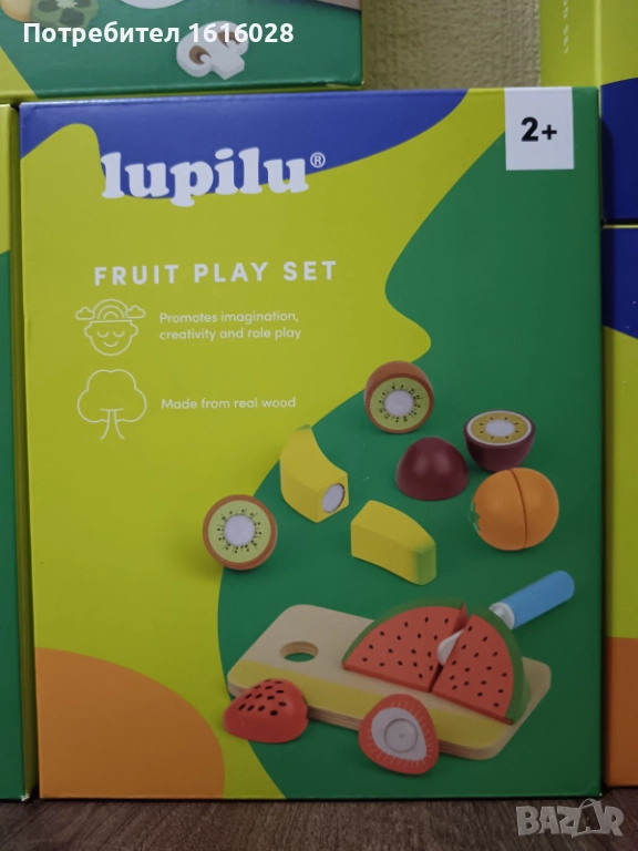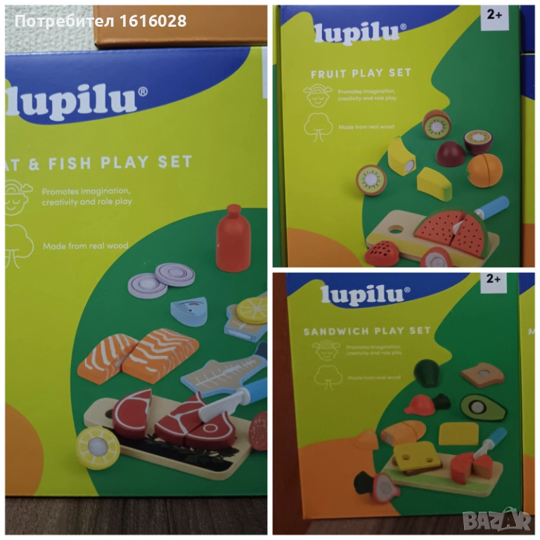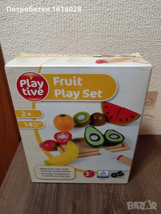 Нови детски дървенни дъски с нож и различни плодове,зеленчуци,сирена,месо и риба,които се разделят на две части и се залепват с велкро една за друга.Комплекта съдържа 8 части,като някои се разделят на две.Произведена от качествено дърво и безвредни бои.