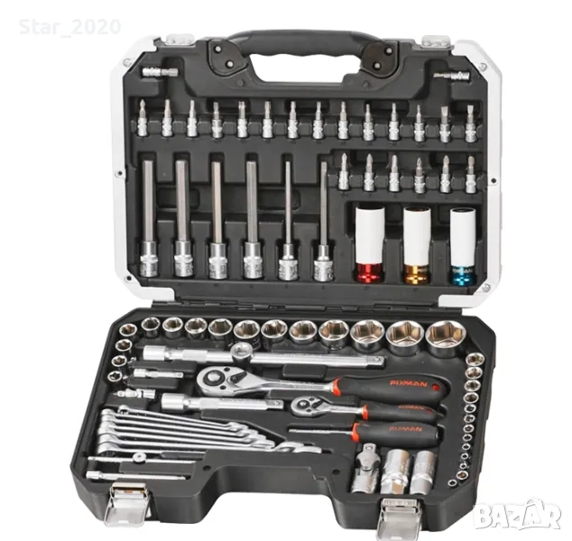 Модел: 73008-B5079M.Комплект Гедоре Fixman- 1/4" & 1/2"- 79 частиТехнически данни:13 x 1/4" Вложки: 4, 4.5, 5, 5.5, 6, 7, 8, 9, 10, 11, 12, 13, 14 mm.15 x 1/2" Вложки: 10, 11, 12, 13, 14, 15, 17, 19, 20, 21, 22, 24, 27, 30, 32 mm.2 x Тресчотки: 1/2" & 1/4", с 72 зъба1 x Ръкохватка тип отвертка 1/4" 2 х Карданна става: 1/4" и 1/2" 1 х Върток 1/4"4 х Удължетия: 1/2" x 125mm и 150mm; 1/4" x 50mm и 100mm.1 х Адаптер: 1/2"(F) x 3/8" (M).2 х Вложки за свещи 1/2": 16 & 21 mm.3 х Ударни вложки 1/2": 17, 19, 21 mm.22 х 1/4" Вложка с накрайник 25mm : H:3, 4, 5, 6, 8 mm; TX:T8, T10, T15, T20, T25, T27, T30, T40; SL:4, 5.5, 7 mm; PH:#1, #2, #3; PZ:#1, #2, #3.6 х 1/2" Вложка с накрайник 100mm: H6, H7, H8, H10, H12, H14.7 х Комбинирани ключове: 8, 10, 11, 12, 14, 17, 19 mm.1 x КуфарЕргономичен дизайн.Гумирани и меки дръжки, против преплъзване и повишен комфорт.Инструментите притежават: TÜV Certificate