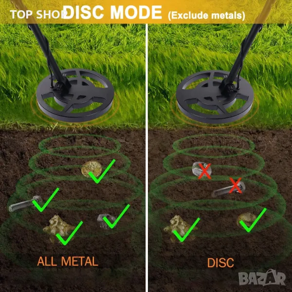 металдетектор в режим „изцяло метал“, можете да търсите различни видове метал с автоматично нивелиране на пода и висока чувствителност. „DISC“ се използва за разграничаване на типа открит метал. И двата режима имат функция за автоматична компенсация на пода и могат да се използват не само за намиране на черни, но и на цветни метали