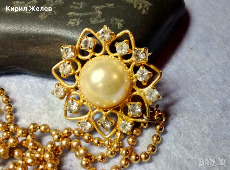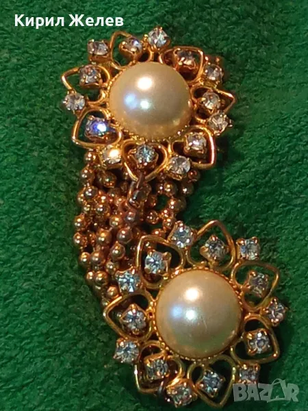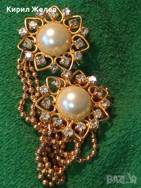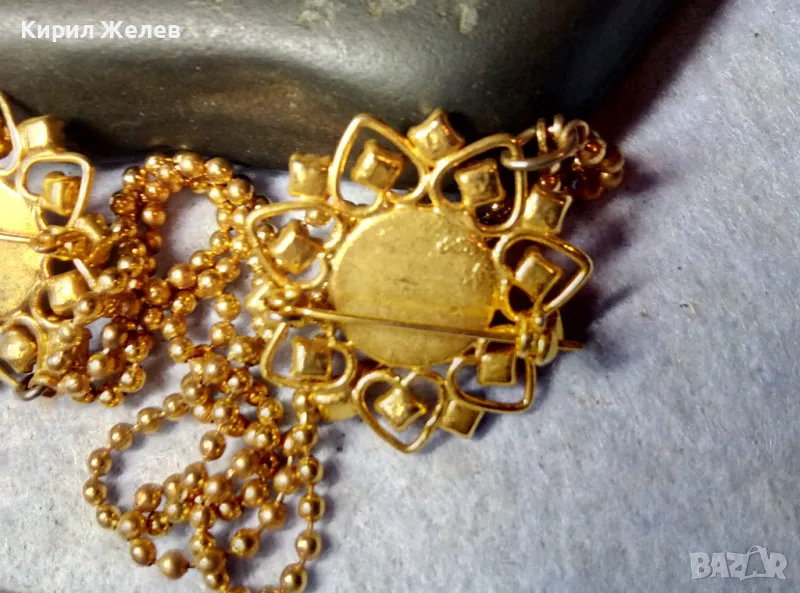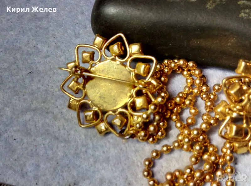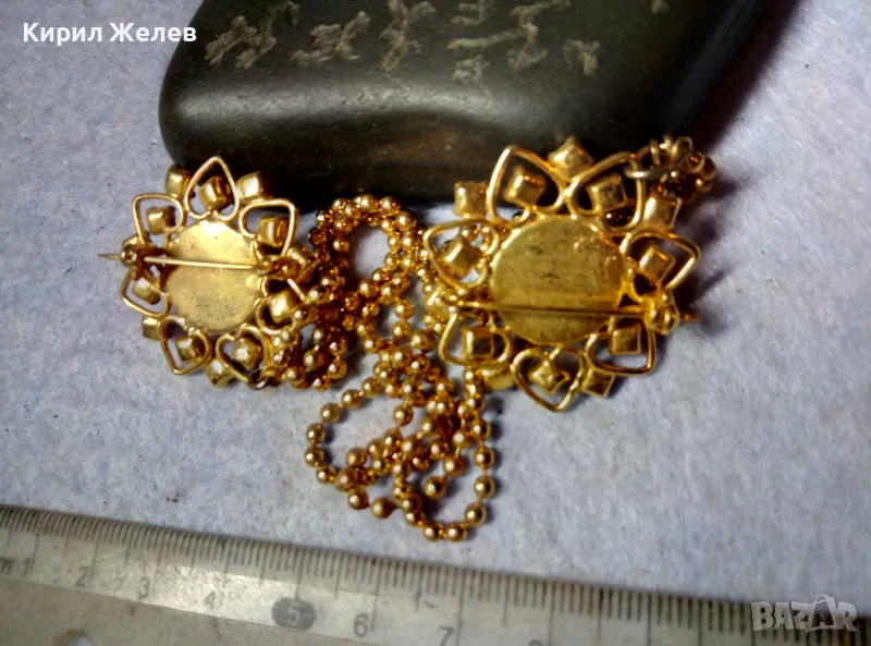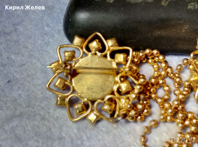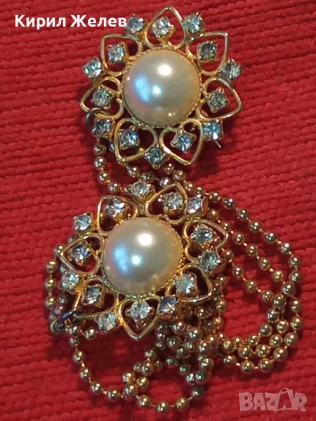 ЕФЕКТНА ПОЗЛАТЕНА ВИНТИДЖ АРТ СТИЛ ДВОЙНА БРОШКА с ВЕРИЖКИ РЯДЪК МОДЕЛ с ИСКРЯЩИ КРИСТАЛИ 75511