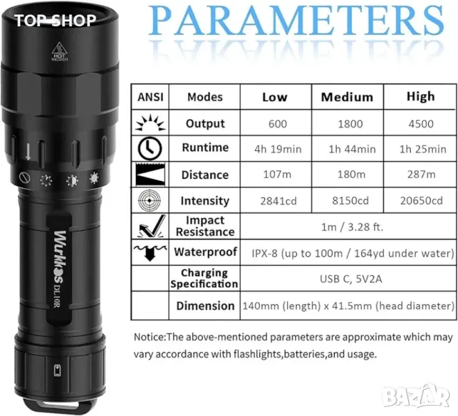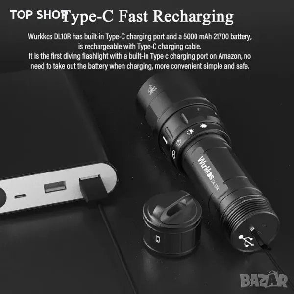 Wurkkos DL10R е професионален, ярък фенер за гмуркане - мощен и водоустойчив според IPX-8. Захранва се от акумулатор, оборудван е със скрит USB-C порт за вътрешно зареждане на