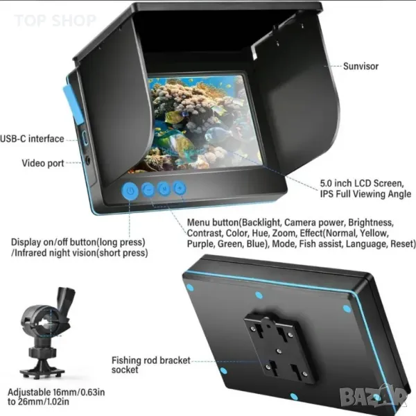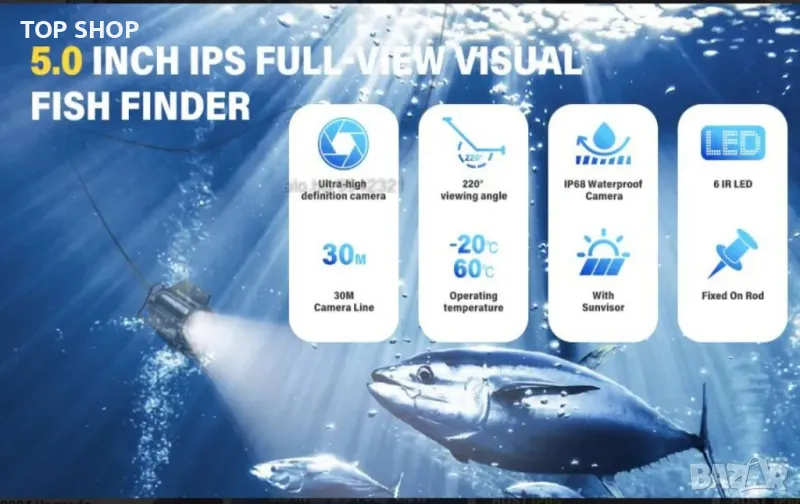 Камера за подводен риболов, търсачка за риба, инфрачервено нощно виждане, широкоъгълна, IP65 водоустойчива, с 5-инчов IPS дисплей, за лед, река и лодкаОтносно този артикул5-инчов IPS екран Visual Fish Finder: Този риботърсач се състои главно от 5-инчов водоустойчив IPS дисплей и IP68 водоустойчива леща, за да формира система за подводна камера. Той е добър помощник за тези, които обичат риболова и земеделието: помага ви да наблюдавате подводни терени, да наблюдавате рибата, също така можете ясно да видите дали рибата кълве на куката, което прави риболова още по-забавен. Основното тяло е IP65 водоустойчиво, процесът на риболов не се страхува от вятър и дъжд.Усъвършенствана водоустойчива камера: 220° видимост и водоустойчива IP68 камера с висока разделителна способност със защита от слънце и 6 инфрачервени светодиода, която може да се вижда ясно на слънчева светлина, нощен риболов при слаба светлина, кална вода и други условия; може да се регулира чрез главните клавиши (бутон за меню, +, - бутон), като например LED и друга яркост (забележка: инфрачервените светодиоди светят, когато изображението се показва в черно и бяло).Дълъг и издръжлив кабел: Кабелът за търсене на риба е с дължина 30 м, което е удобно за използване в дълбоки води. Устойчив е на студ, натиск и корозия; максималната товароносимост е 80 кг, което не се страхува от големи риби.Вградена 8000mAh батерия: Този визуален търсач на риба има вградена 8000mAh батерия, която може да се използва непрекъснато в продължение на 9-10 часа, когато е напълно заредена. Може да се зарежда и с power bank, което е удобно за използване на открито.Лесно закрепване към въдица: Може да се прикрепи към въдицата с държача, за да можете да работите по-удобно и да се забавлявате неочаквано.Подходящ за различни сценарии: Висококачественият подводен риботърсач е най-добрият подарък и инструмент за фермери и тези, които обичат риболова. Това е продукт, подходящ за използване в различни сценарии. Например, фермерите могат да наблюдават рибата и рибата. Използва се за риболов на лед, морски риболов, езера, реки, езера, риболов с лодка и др.