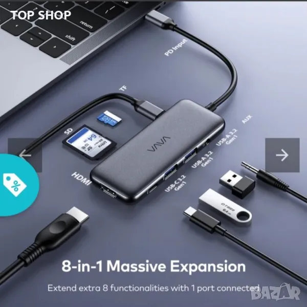 Разширява USB-C порта на вашия лаптоп, за да включва 1 HDMI порт, 1 USB-C 3.1 порт, 2 USB-A 3.2 порта, 1 PD порт за зареждане, 1 слот за SD карта, 1 слот за TF карта, и 1 3,5 mm AUX порт, за да можете да използвате интелигентни устройства едновременно на вашия USB-C лаптоп или таблет