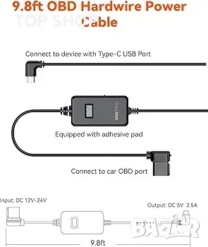 VANTRUE 10ft USB OBD тип C захранващ кабел с LED дисплей