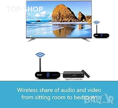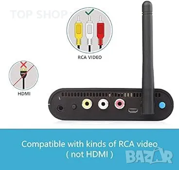 【Plug and play, няма нужда от драйвери】wif видео предавател няма нужда от повече настройки и няма нужда от повече драйвер. Поддръжка на безжичен видео предавател за използване с всяко AV изходно устройство, VCD, DVD, IPTV, DVR, сателитен приемник, STB цифрова камера за видеонаблюдение и т.н., но не искате да използвате дългите и скъпи кабели за устройствата. Безжичното предаване формира локален сигнал за споделяне, за да се реализира гледане на телевизия от хола до спалнята.