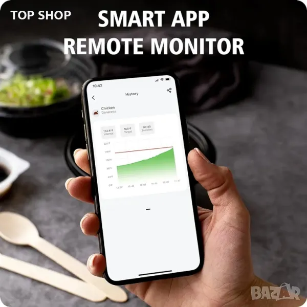 УМНО ПРИЛОЖЕНИЕ КОНТРОЛ: Интелигентното приложение без регистрация разполага с множество предварително зададени настройки за месо на USDA, персонализирани температури, температурни графики за изтегляне, история на спестяванията, интелигентни сигнали и много други. Опростете и рационализирайте кухнята си.