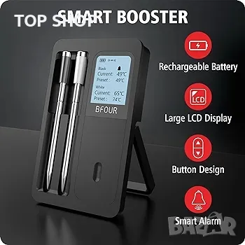 БУСТЕР С LCD ДИСПЛЕЙ: Наблюдавайте температурите в реално време на големия екран на бустера по всяко време, без да се консултирате с приложението. Той е видим, зарежда се и се управлява дистанционно. Прави готвенето по-лесно и удобно.
