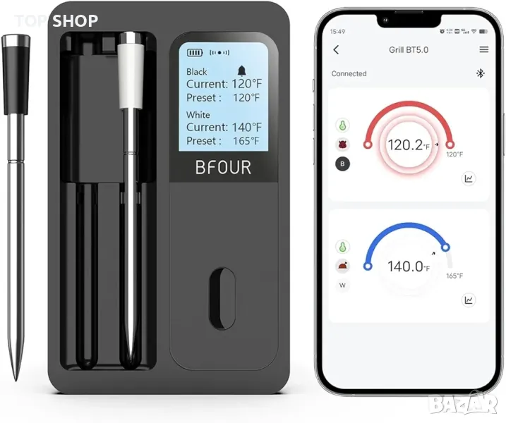 BFOUR Безжичен термометър за месо с 2 сонди за месо, Интелигентен безжичен Bluetooth