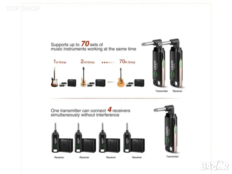 LEKATO безжична китарна система с актуализирани 70 канала, може да поддържа до 70 комплекта музикални инструменти, работещи едновременно (всеки инструмент се свързва към съответния високоговорител)
