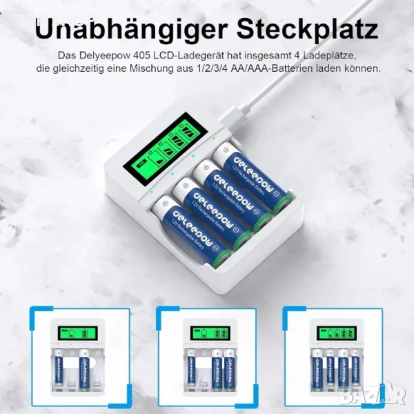 4 отделни слота - Delyeepow NiMH зарядно вграден интелигентен LCD дисплей, лесен за познаване на процеса на зареждане. Можете да зареждате с комбинация от 1 / 2 / 3 / 4 части AA / AAA Ni-MH / Ni-CD батерия.