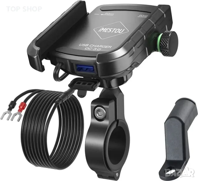 100% здрав и надежден: Изработено от алуминий, USB зарядното за телефон за мотоциклет може да се монтира по-стабилно на кормилото. Регулируемите затягащи рамена, които могат да се регулират максимално. Широчина 90 mm надеждно държи повечето смартфони от 4,0 до 6,8 инча.