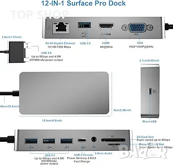 ✔️【12-в-1 Microsoft Surface Combo Dock】Разширете своя Surface Pro 4/Pro 5/Pro 6 порта до 4K HDMI и 1080P VGA видео изход, Gigabit Ethernet порт, Micro SD (TF) и четец на SD карти, 3 порта USB 3.0, 1 USB 2.0 порт, 3,5 мм порт за жак за слушалки, 5 V микро USB порт и USB 3.1 порт (за прехвърляне на дата). Идеален избор за Microsoft Surface Pro 4-то/5-то/6-то поколение. Просто включете и пуснете, нов Surface Dock без компромис с достъпността.