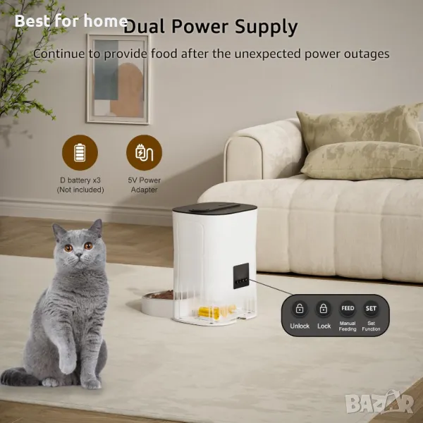 Никога не пропускайте хранене: Автоматичният диспенсър за суха котешка храна Balimo с таймер, проектиран от структура с двоен ротор и наклонен изход за храна предотвратява засядане на храна, докато дизайнът на шестия ротор осигурява гладко и прецизно хранене. Тази хранилка за котки с таймер може да се избира между фиксирана кабелна връзка или преносимо захранване с батерия (не е включена), за да сте сигурни, че вашият домашен любимец никога няма да остане гладен по време на прекъсвания на електрозахранването. Резервната памет гарантира, че няма пропуснато хранене дори в случай на прекъсване на захранването.