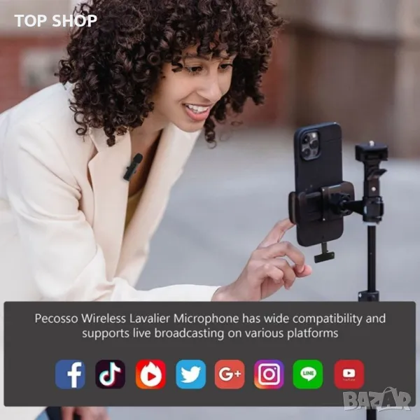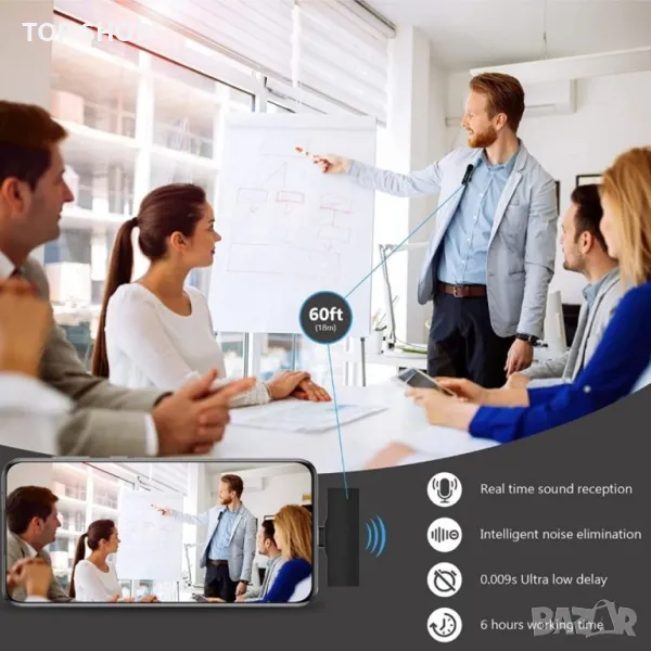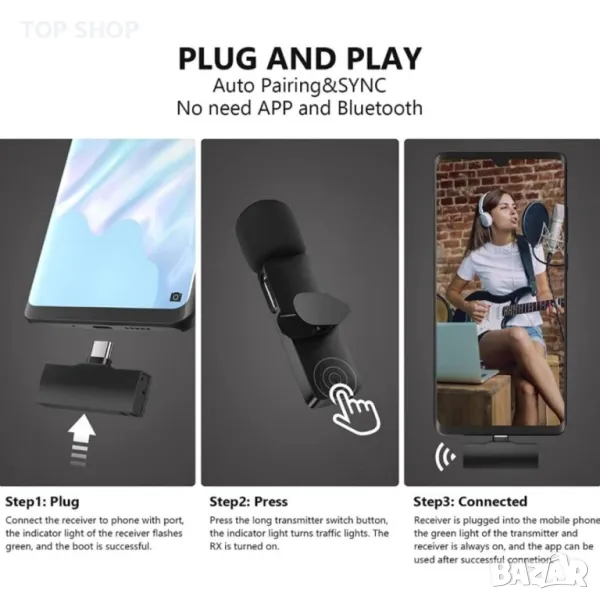 Plug - and - play, няма нужда от приложение: няма нужда от приложение или Bluetooth, продуктът включва микрофон и приемник (порт за осветление), просто закачете микрофона на яката и поставете приемника в устройството, те се свързват автоматично. Директно plug-and-play, без приложение и Bluetooth. Използвайте лесно YouTube / Facebook на живо, tiktok, виртуални блогове, блогове, подкасти, интервюта и други видео записи.
