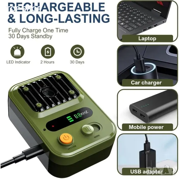 Нашето устройство за контрол на лаенето има три регулируеми режима, Режим 1 (15-30kHz): променлива честота, подходящ за ядосани или големи кучета, Режим 2 (20kHz): по-подходящ за нежни кучета и Режим 3 (30kHz): по-подходящ за малки кучета . кучета. Независимо дали имате нужда от нежни напомняния за кучета, които лаят леко, или от по-силно възпиращо средство за упорити лаещи, нашата запушалка за лаене може да отговори на вашите нужди. Изберете режима, който най-добре подхожда на вашия космат приятел и се насладете на по-спокойна и тиха среда.