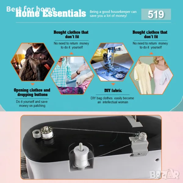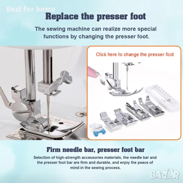 Сменяемо притискащо краче: Автоматичният дизайн на подгъва улеснява изработването на подгънати долни конци. Дизайнът на сменяемото притискащо краче позволява по-специални функции за шиене чрез замяна на различни притискащи крачета. Мини шевната машина разполага с метален дизайн на върха на куката, който е издръжлив и не скача.
