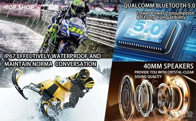 Съвместими с различни Bluetooth устройства: Нашите Bluetooth слушалки не само позволяват безпроблемна комуникация, но също така разполагат с висококачествени стерео слушалки с шумопотискане. Плюс това, Bluetooth мотоциклетната каска се свързва с други Bluetooth устройства (като други Bluetooth слушалки или вашия телефон), поддържането на връзка никога не е било по-лесно.