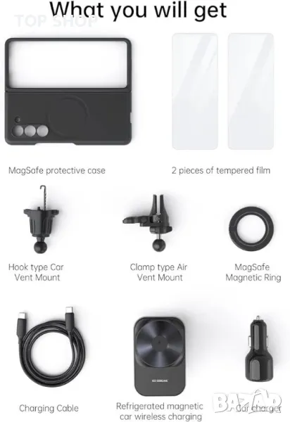 зарядно за кола се предлага с отделен Mag-safe калъф за Samsung Galaxy Z Fold 5, вграден магнитен пръстен N52, силно магнитно привличане, може да държи здраво телефона ви, дори когато шофирайте по неравния път, това все още може да предотврати падането на телефона ви.