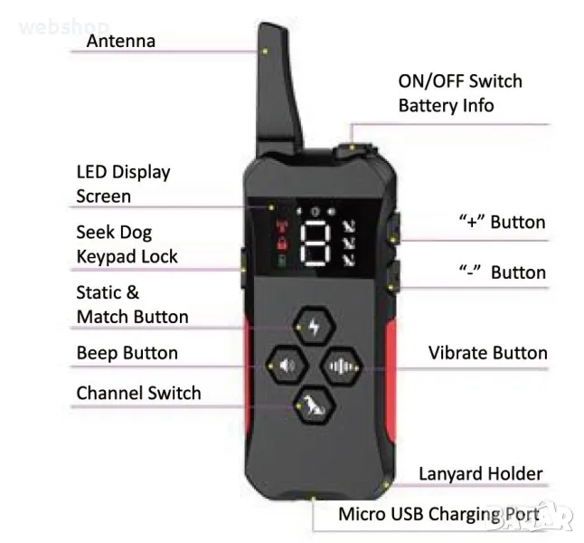 Идеален за използване при всякакви метеорологични условия – дъжд, сняг или дори при игра край водата. Множество режими на обучение - нашийникът разполага с опции за вибрации, звук и безопасен електрически импулс, които можете да настройвате според нуждите на вашето куче. Работи на разстояние до 800 метра, което ви дава свобода при тренировки на открито. Ясен LCD дисплей за удобство при управление и регулиране на нивата.