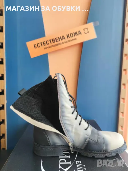 Дамски боти от естествена кожа произведени в България. Фирма "Кристиян" - Габрово. Изключително интересн и атрактивен модел. Топъл хастар и гумено противохлъзгащо ходило. Дължина на стелка - № 36 - 22,5см/ 37 - 23см/ 38 - 24,5см/ 39 - 25см/ 40 - 25,5см/ 41 - 26,5см. Изпращаме с преглед и тест.