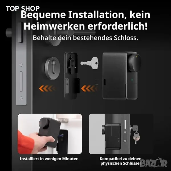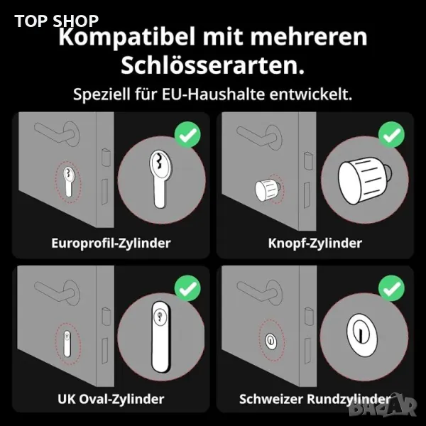 Подобрена съвместимост Алуминиевата сплав на корпуса осигурява по-здрав и издръжлив дизайн. Нашата интелигентна брава, която може да се монтира допълнително, елиминира необходимостта от пробиване на дупки и позволява лесен и бърз монтаж на ключалката на вашата врата, без да поврежда съществуващата брава. EU: Lock Pro е съвместим с евро цилиндри, британски овални цилиндри, швейцарски кръгли цилиндри и бутонни цилиндри. Забележка: Моля, проверете съвместимостта преди покупка.