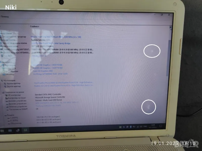 Дисплей: 15,6 инча, гланц, резолюция 1366х768 HD Ready, има два бели петна (виж снимка) не пречащи за работа.