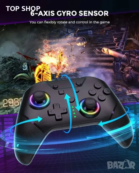 Регулируема вибрация и 6-осен жироскоп: Геймпадът Switch Pro има вградени двойни мотори, поддържа 4-степенна вибрационна обратна връзка (100%-70%-30%-0%) и използва чувствителен 6-осен жироскопичен сензор, за да осигури Прецизен контрол на възприятието на движението, който може да ви донесе завладяващо игрово изживяване.