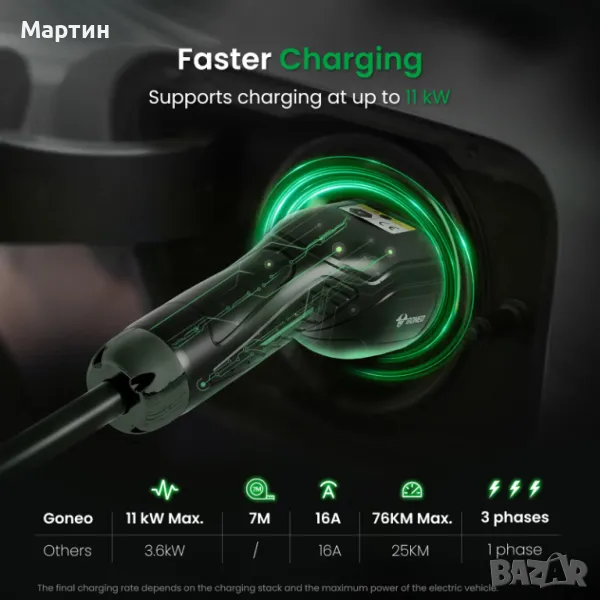 50% по-бързо зареждане спрямо стандартния кабел от 7,2 kW: Кабелът за зареждане на електрически превозни средства тип 2 поддържа мощност на зареждане до 11 kW, което ви позволява да достигнете обхват от 76 km само за един час.