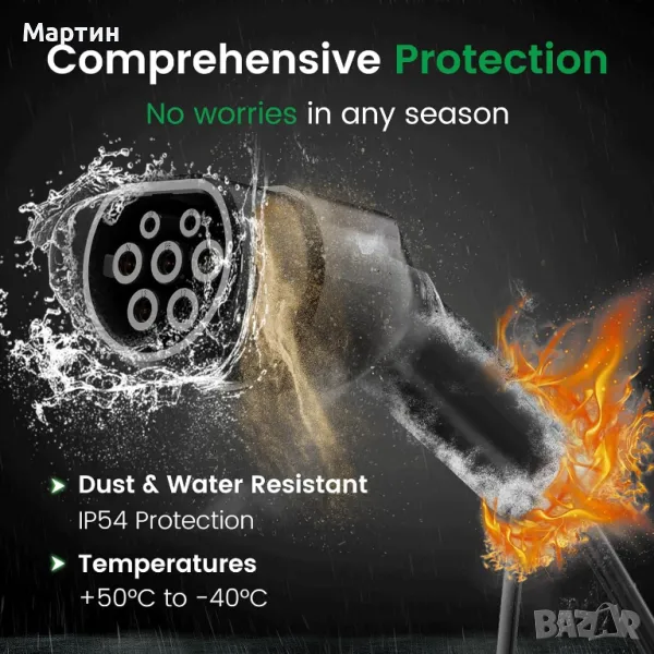 Купувайте с увереност: IEC 62196, водоустойчив (IP54) и с висококачествен TPU кабел за устойчивост на абразия и устойчивост на огъване. Той е тестван за щепселни връзки 10 000 пъти, има товароносимост от 2 тона и е преминал успешно тест за изпускане от височина 1 метър, за да се избегнат рискове за безопасността