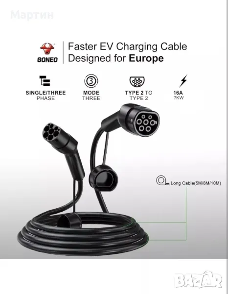 Кабел за зареждане Тип 2 към Тип 2 GONEO 7метра 11kW 16A: 320лв