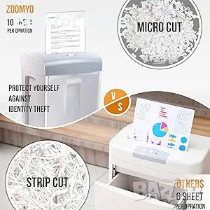 шредер на квадратчета Zoomyo с 10 листа с кръстосано рязане, раздробява хартия, CD, DVD, кредитни карти
