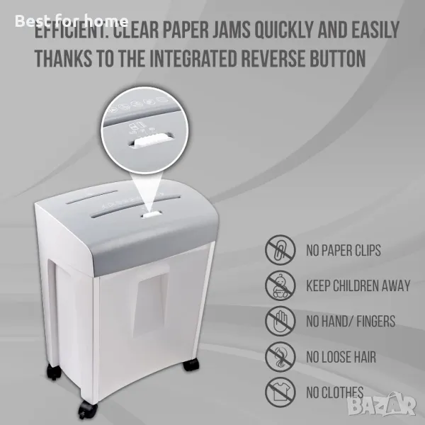 Като специална характеристика, шредерът за документи има практична основа на четири колела, която ви позволява да премествате шредера за документи върху повърхности като ламинат, килим, линолеум, иглен филц без никакви проблеми. И разбира се, включено е ръководство на английски език.