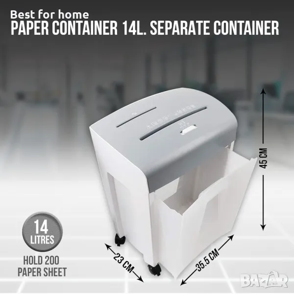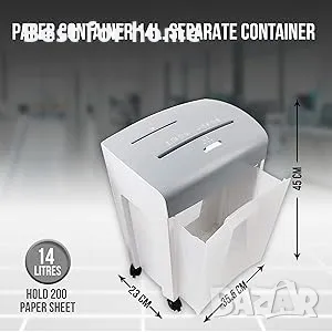 Нашият шредер за хартия не може да бъде по-лесен за използване: вместо ръчно да отстранявате режещия модул всеки път, за да изпразните кофата за боклук, просто издърпайте 14-литровия кош, който се доставя с опаковката, за бързо и лесно затваряне на нарязаната хартия за изхвърляне.