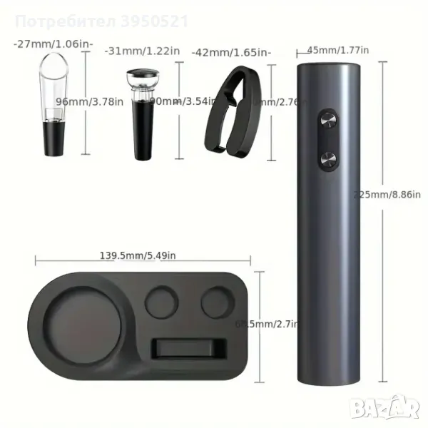 - Нашият комплект за отваряне на вино включва изливащо устройство, нож за фолио, вакуумна запушалка и основа за съхранение. С този пълен комплект имате всички основни инструменти, за да сервирате и съхранявате вашето вино с лекота.