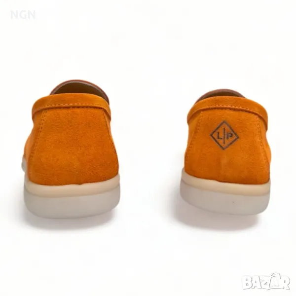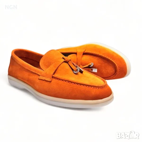Дизайнерски, луксозни и супер модерни дамски мокасини с изчистен италиански дизайн Loro Piana и стилен метален аксесоар в сребрист цвят. Модел изработен изцяло от висококачествен естествен велур и стелка от естествена кожа в оранжев цвят. Модерни, атрактивни и различни дизайнерски дамски мокасини.