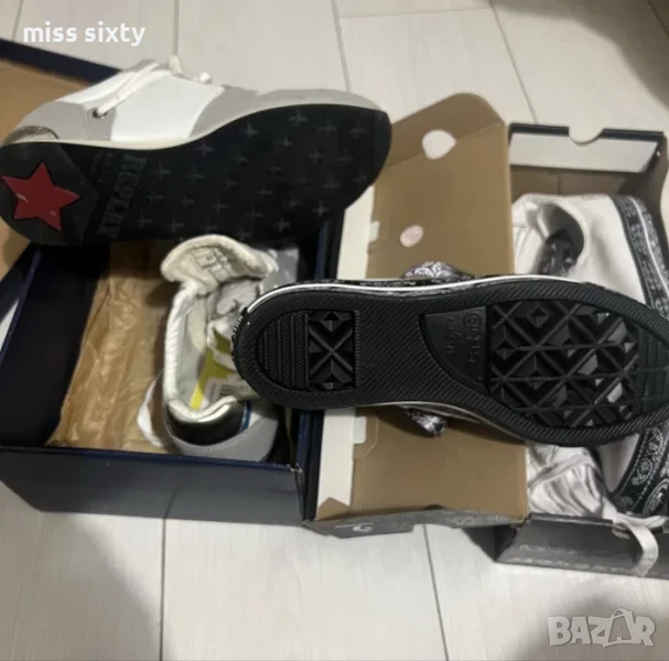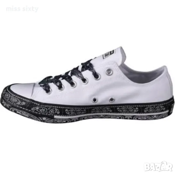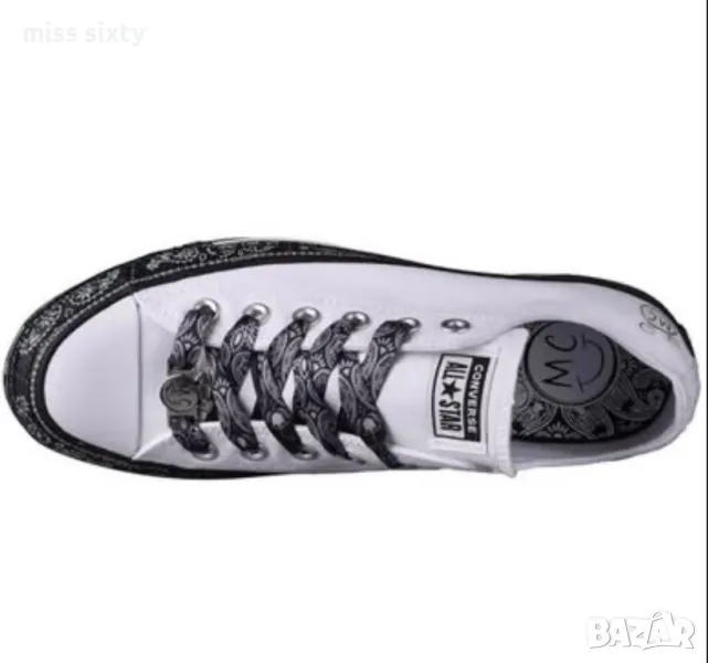 Страхотни кецове Converse в бял цвят, изработени от висококачествени материали, комбинация от текстил и синтетика. Моделът е част от колекцията на Converse, съвместно със световно известната певица Miley Cyrus. След излизането си на пазара още през 2017г., тя предизвика голям интерес с преобразяването на красическия дизайн за постигане на страхотна модерна визия. Моделът е с нисък, изчистен дизайн с контрастни кашмирени мотиви върху връзките и подметката. Кецовете имат метален детайл с лого на Miley Cyrus и лого на бранда разположено върху езика на обувките. Кецовете са с равна подметка, изработена от устойчива на износване гума. Изключително леки и удобни, подходящи както за всеки ден, така и за спорт.