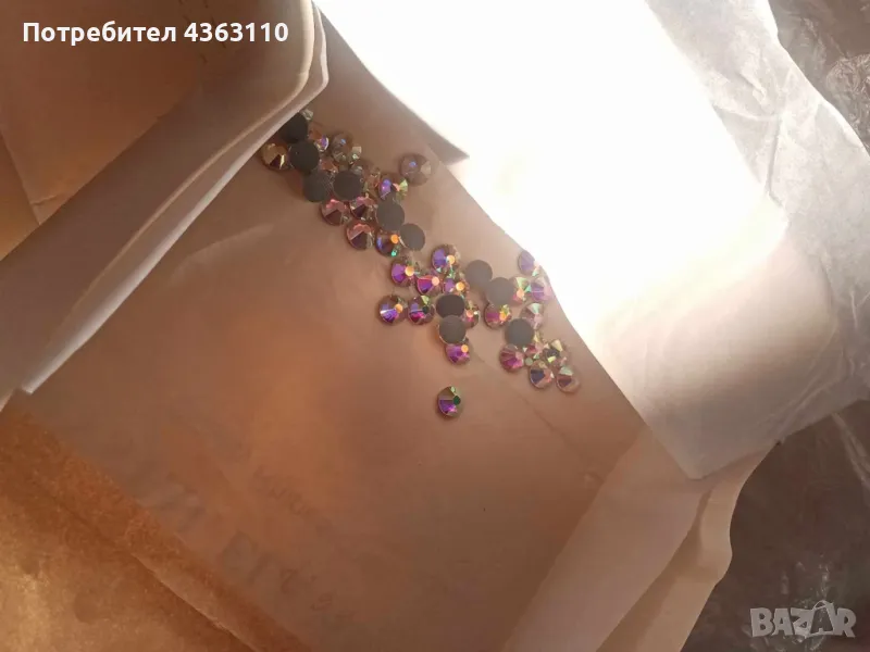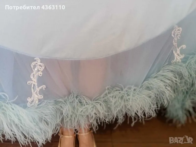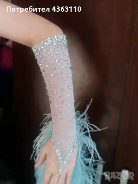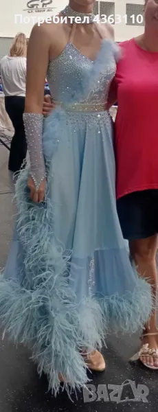 Роклята е шита с английски платове и с естествени 6 пластни щтраусови пера. Само перата ни струваха 450 лв преди шева. Има прозрачна част с орнаменти. Към нея подаряваме резервни кристали, още толкова орнаменти, уред за лепене на кристали.Носена е 2 пъти. Стои много красиво на дансинга и бих пратила клипче при интерес. На снимките не се вижда хубаво красотата й.