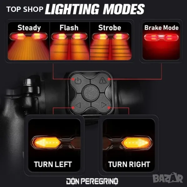?? Гъвкав с множество режими ---- 3 режима като задна светлина: стабилна, светкавица и светкавица; 2 режима като мигач за велосипед: завийте наляво и завийте надясно; 1 режим като спирачна лампа: постоянен при висока яркост, активиран от дистанционното.