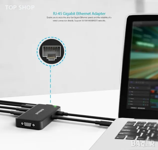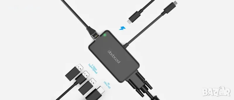 Разширете три SuperSpeed USB 3.0 порта, един USB Power Delivery Type-C порт за зареждане, един HD изходен порт, един VGA порт и един RJ-45 Ethernet порт от един USB-C порт или Thunderbolt 3 (USB-C) порт.